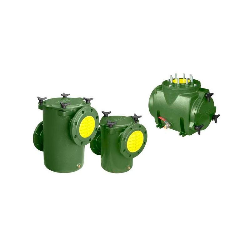 Vaso y tapa prefiltro en fundición de hierro con un pretratamiento de pintura epoxi-poliester y secado al horno para darle más durabilidad y resistencia a la oxidación, con pomos y cesta en acero inoxidable AISI-316.