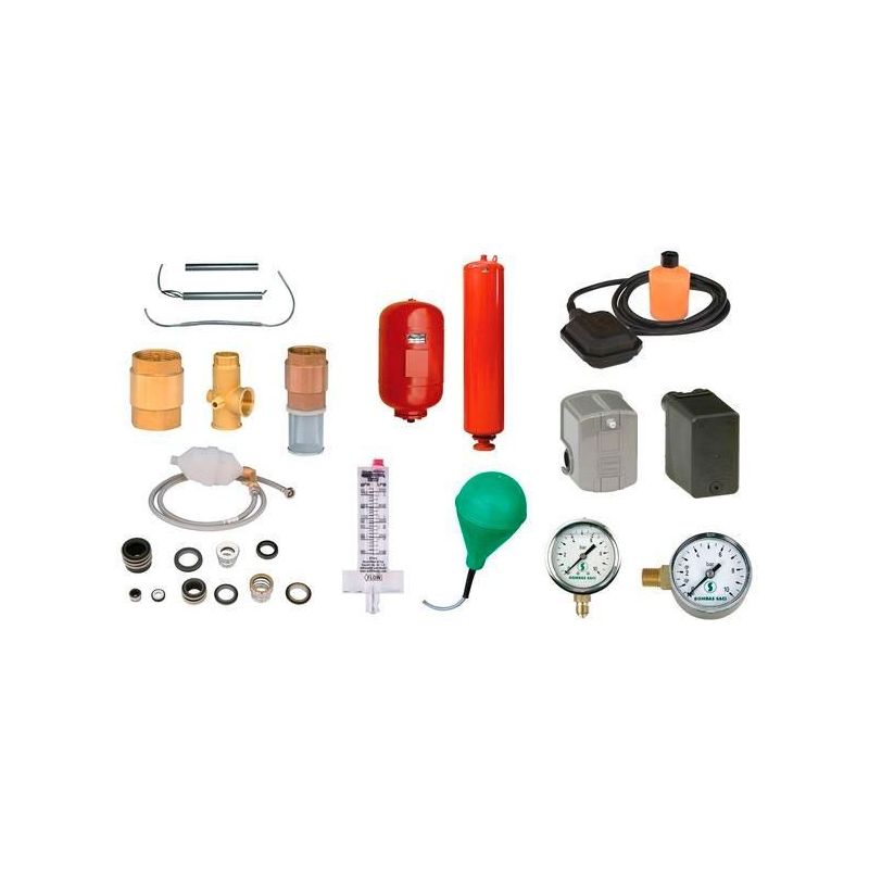 Válvulas, inyectores de aire, caudalímetros, depósitos antiariete, empalme termoretráctil, sellos mecánicos, presostatos, rácores, manómetros, interrruptores de nivel de agua limpia y sucia