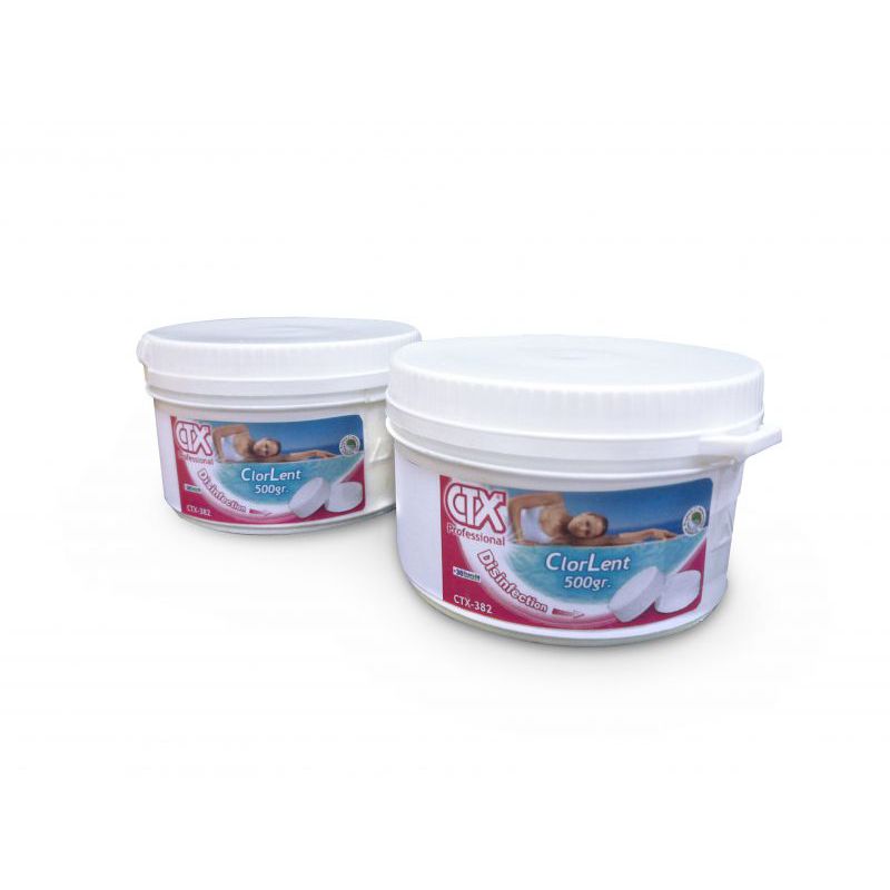 Tratamiento de mantenimiento: Con el pH del agua ajustado, añadir 1 Bloque de CTX-382 ClorLent 500gr. por cada 20 m3 de agua cada 3 o 4 semanas.