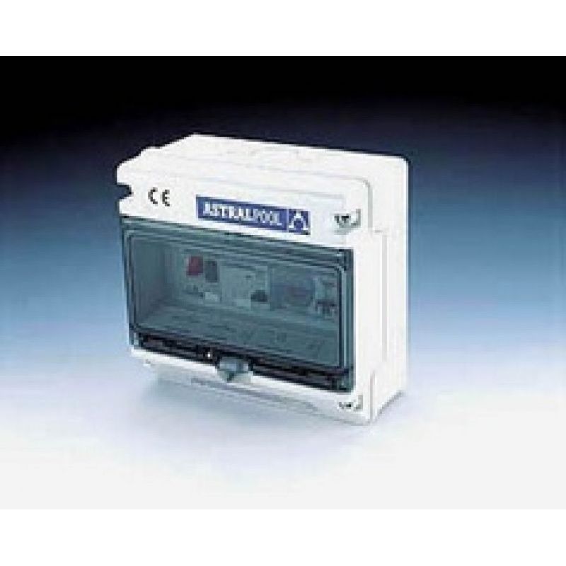 Dependiendo de la corriente nominal de la bomba de filtración se debe seleccionar el tipo de armario: Protección magnetotérmico (1,6 hasta 10A) contactor, reloj de programación 24 h. 3 posiciones Auto / 0 / manual. 230V 16A Salida protegida y controlada para luces