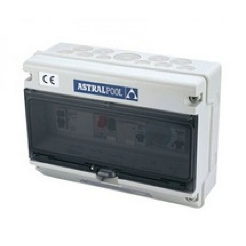 Dependiendo de la corriente nominal de la bomba de filtración se debe seleccionar el tipo de armario: Protección magnetotérmico (1,6 hasta 10A) contactor, reloj de programación 24 h. 3 posiciones: Auto / 0 / manual. 230V 10A Salida protegida y controlada para luces. Monofásico