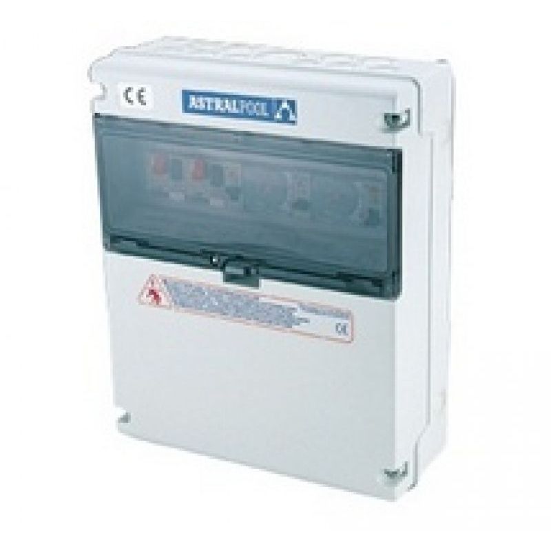 Dependiendo de la corriente nominal de la bomba de filtración se debe seleccionar el tipo de armario: Protección magnetotérmico (2 bombas: 1ª de 6 a 10A y 2ª de a 10A) contactor, reloj de programación 24 h. 3 posiciones: Auto / 0 / manual. 230V 10A Salida protegida para luces. 12V 630VA salida protegida para 2 luces subacuáticas.