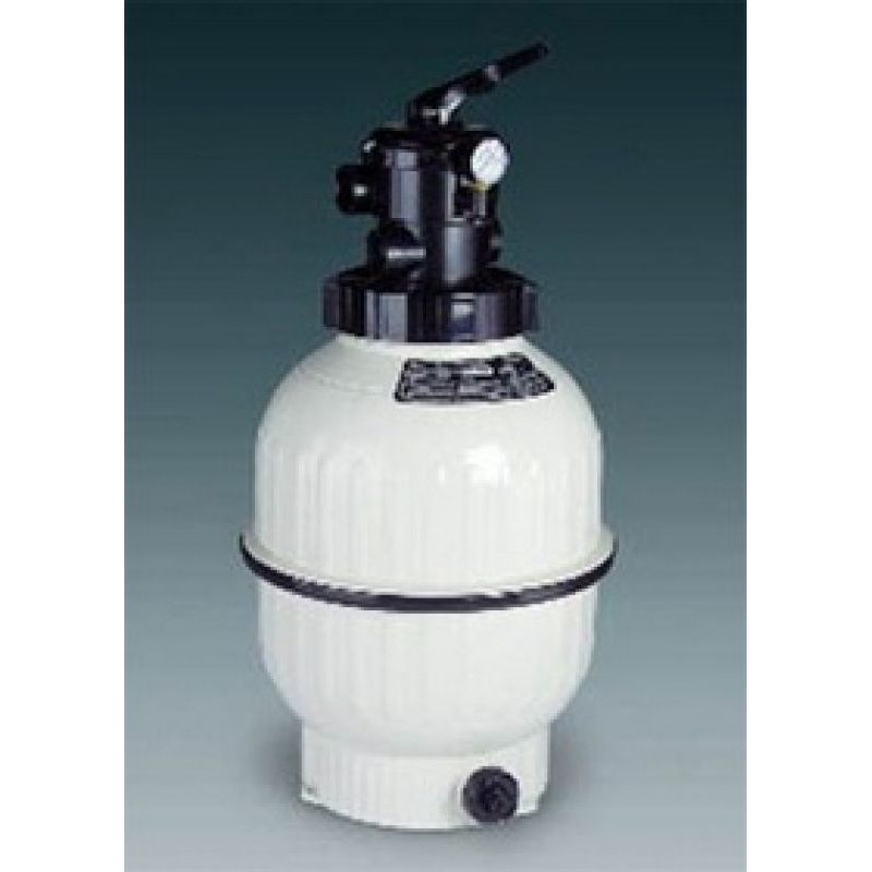 Filtro inyectado en plásticos técnicos. Color marfil. Unión de la parte superior e inferior del filtro mediante soldadura térmica. Equipado con manómetro, purgas de agua y aire manuales. Válvula selectora incluida. Velocidad máx. de filtración de 50 m3/h/m2. Presión máxima de trabajo: 2,5 kg/cm2. Tapa del filtro roscada en material plástico ABS.